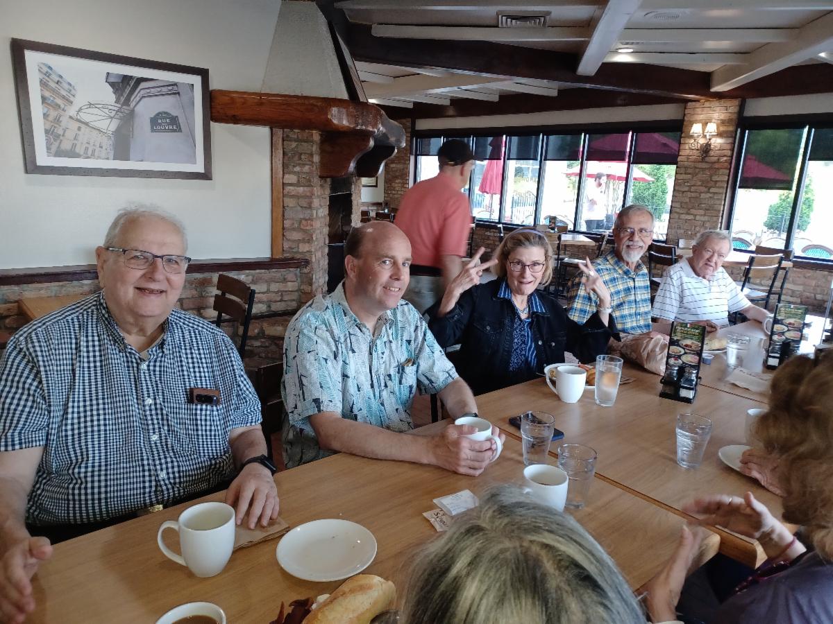 The Breakfast Club continues to chug along each Wednesday morning at La Madeleine. Recently we’ve been averaging 14 to 18 attendees. Our starting time is officially 8:00 AM, but not everyone, including the Coordinator, can make it there quite that early. We have no formal program, just casual conversation until 8:30, when we begin “check-in,” which lasts around 30 minutes, depending on how many have something to report. After that, people start leaving, but some stay longer and resume casual conversation in small groups. – Ron Wise, Club Coordinator. Photo from a June meeting courtesy of Lee Cooper.